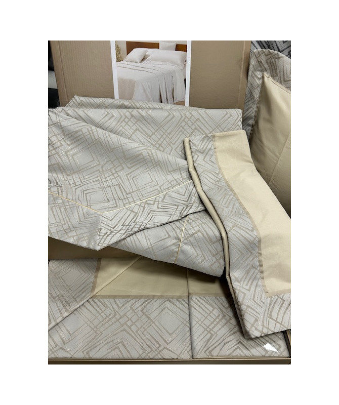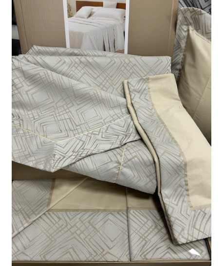 Il bauletto comprende Copriletto in tessuto jacquard disegno geometrico con profilo completo lenzuola in puro cotone con bordo in tessuto jacquard federe in cotone con tre volant in tessuto jacquard misure copriletto 270x270 lenzuolo sopra 270x290 lenzuolo con algoli 180x200+25 due federe 50x80 prodotto artigianalmete in Italia