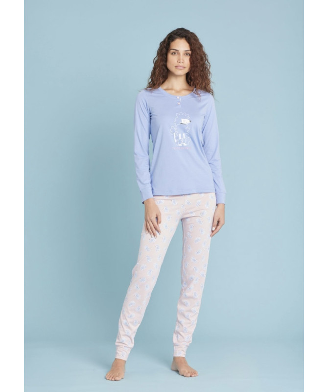 Pigiama donna 100% cotone Noidinotte con polsino su manica e pantalone simpatico con cagnolino stampato sulla maglia e pantalone con microfantasia