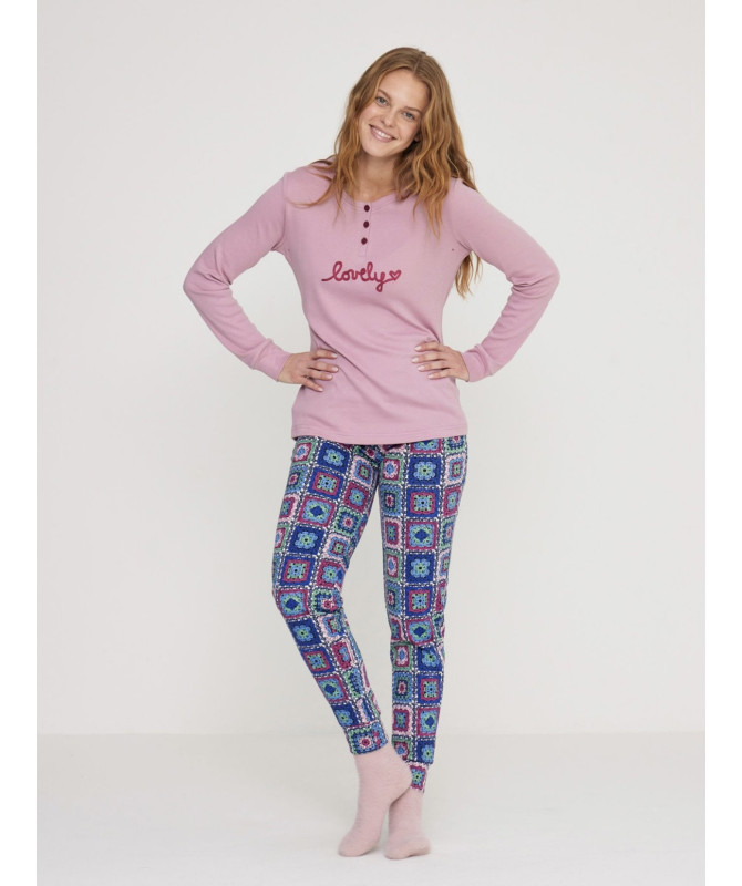 Pigiama donna in caldo cotone Noidnotte con semplici applicazioni sulla maglia e pantalone a scacchi polsino su manica e pantalone
