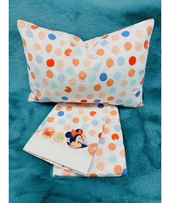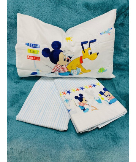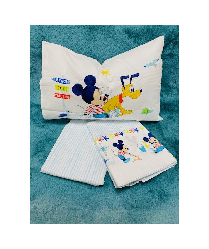 Completo lenzuola per lettino con le barre in puro cotone con baby Mikey e Minnie di Caleffi lenzuolo per sotto con angoli 60x120 lenzuolo sopra 120x180 federa 40x60