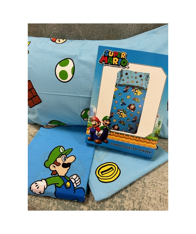 Stampa dei personaggi all-over su federa e lenzuolo sopra mentre il lenzuolo con angoli in titnta unita Prodotto importato da Hermet srl, azienda Italiana. disponibile solo per letto singolo misura lenzuolo con angolo 85x195 lenzulo sopra 150x280 federa 50x80