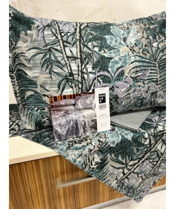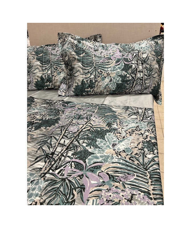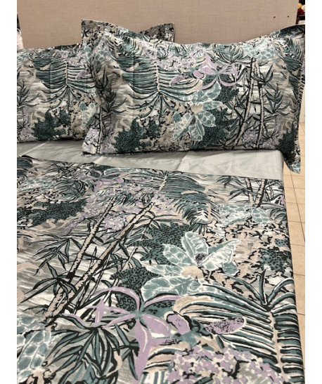 Completo lenzuola copriletto Brasilia Reveer lenzuolo sopra stapato con ribaltina colorata sotto con angoli in tinta unita il tutto relizzato con raso di cotone300 fili di alta qualit lenzuolo con angoli 180x200+28 lenzuolo sopra 250x290 federe con 3 volant