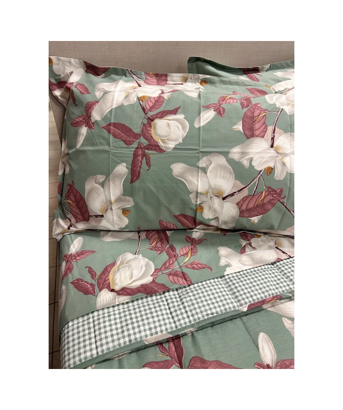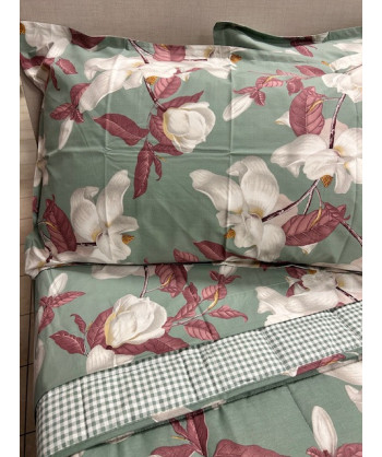 Completo lenzuola matrimoniale con stampa piazzata su raso di cotone, lenzuolo sotto in raso di cotone tinta unita.
