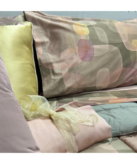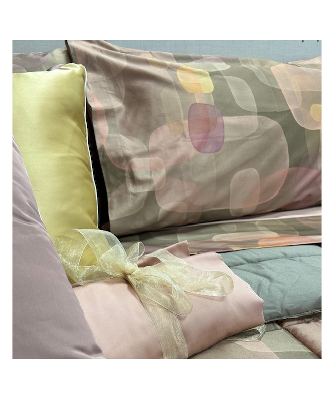 Completo lenzuola copriletto matrimoniale Reevr - 1 lenzuolo sopra con balza copriletto 265 x 290 cm - 1 lenzuolo sotto con angoli 180 x 200 + 28 cm - 2 federe a sacco 52 x 82 cm doubleface Tessuto: Raso 100% cotone 300 fili in stampa digitale