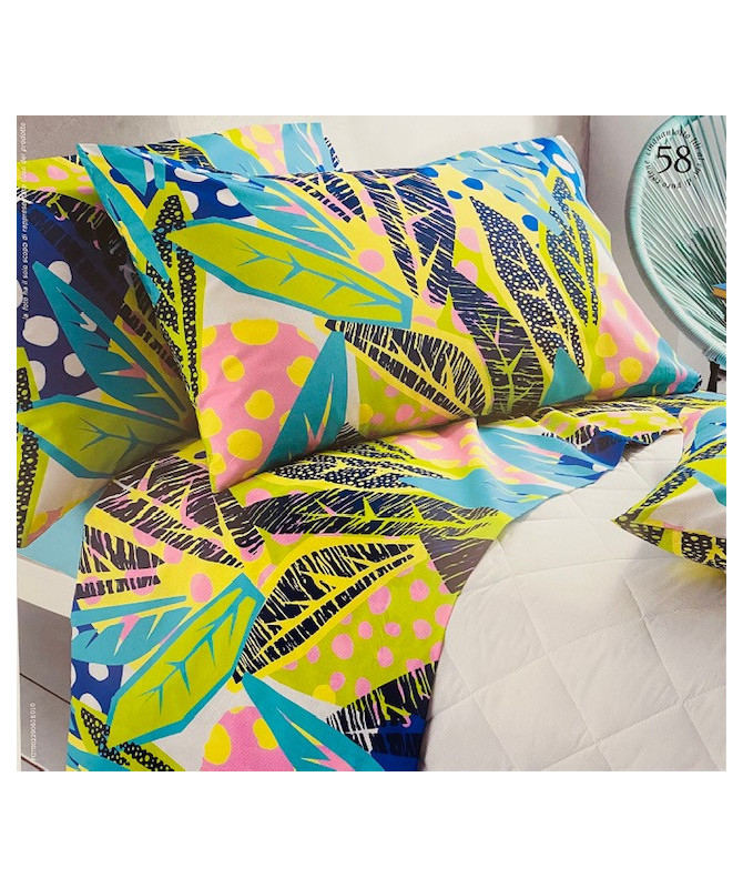 Completo lenzuola Tropical collezione Teen Gabel stampato su madapolam di puro cotone da 58 fili mq disponibile nelle dimensioni: una piazza cm 160x290 sottolenzuolo cm 90x200 una piazza e mezza maxi cm 200x290 sottolenzuolo cm 125x200
