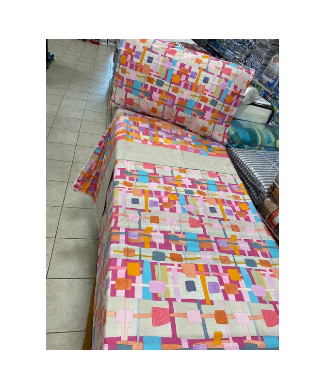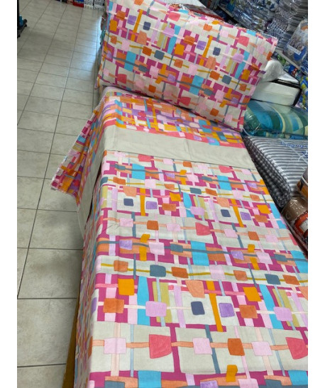 Completo lenzuola copriletto Rivira Il lenzuolo sopra con geometrica e ribaltina con la stessa stampa Lenzuolo sotto con un tenue scacco e la federa double face Disponibile nella misura Singolo sotto 90x200 + 28 sopra 150x280 fedara 50x80 Una piazza e mezzo sotto 130x200 + 28 sopra 180x280