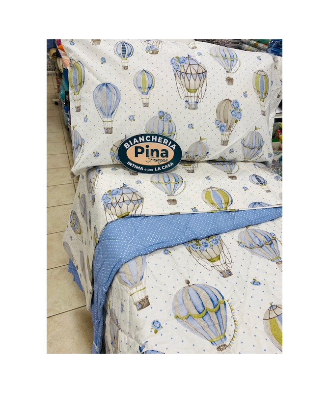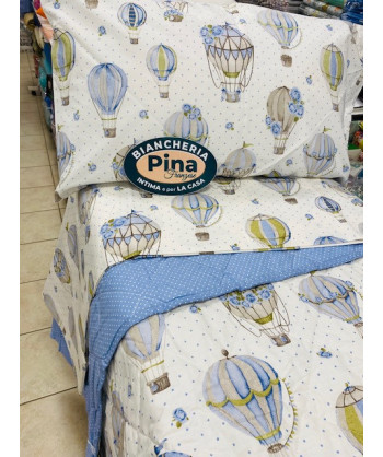 Completo lenzuola con delicata stampa mongolfiere in colori pastello.
