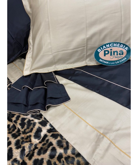 Set 4 pezzi composto da: 1 lenzuolo sopra 250x290 cm 2 federe a 3 volani 50x80 cm 1 lenzuolo sotto con angoli 180x200 cm Tessuto: 100% raso di cotone 300 TC Made in Italy