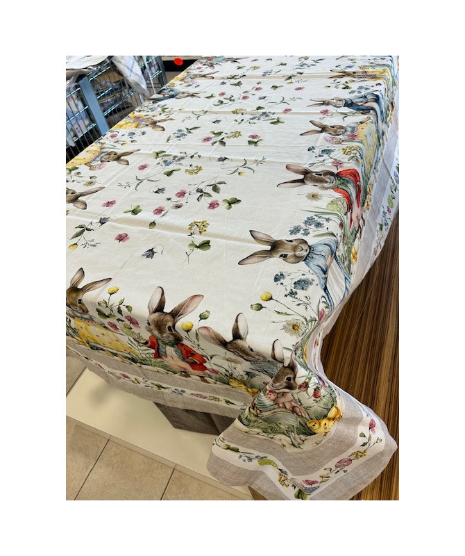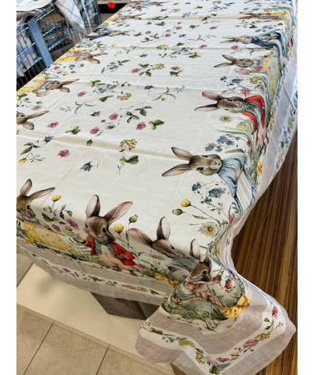 Tovaglia in puro cotone disponibile nelle misure per 6 persone 140x180 per 12 persone 140x250 con grazione stampe a tema Pasquale.