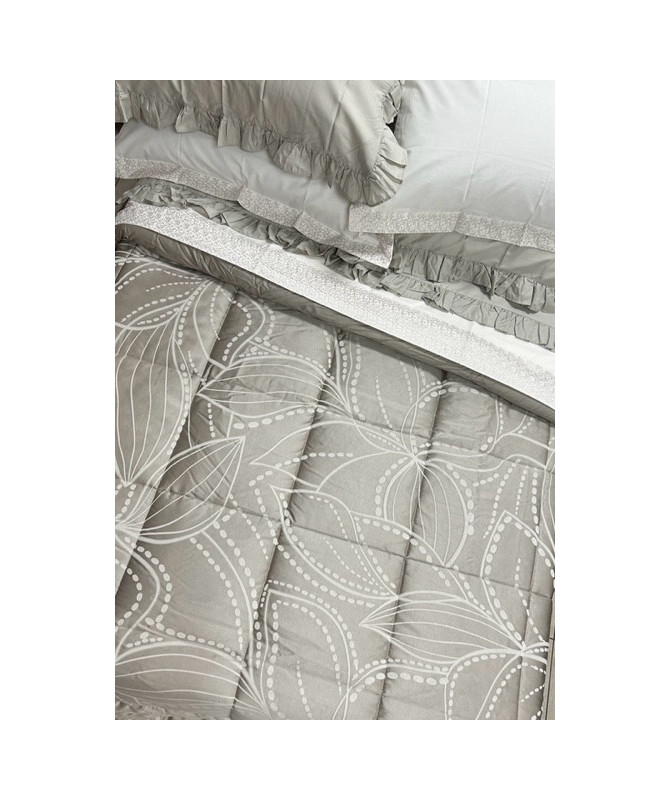 Con elegante stampa floreale su tessuto di puro cotone. Imbottitura con fibra di polestere rigenerato 320gr/mq Misura matrimoniale 260x260 Prodotta interamente in Italia