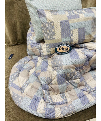 Trapuntatura piazzata a quadri con tre cornici e chiusura con angoli a trapezio. imbottitura in poliestere riciclato 330grmq matrimonliale 260x270