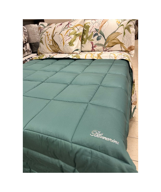 Trapunta matrimoniale trapuntata in puro raso di cotone tinta unita con logo Blumarine in cristalli Swarovski.