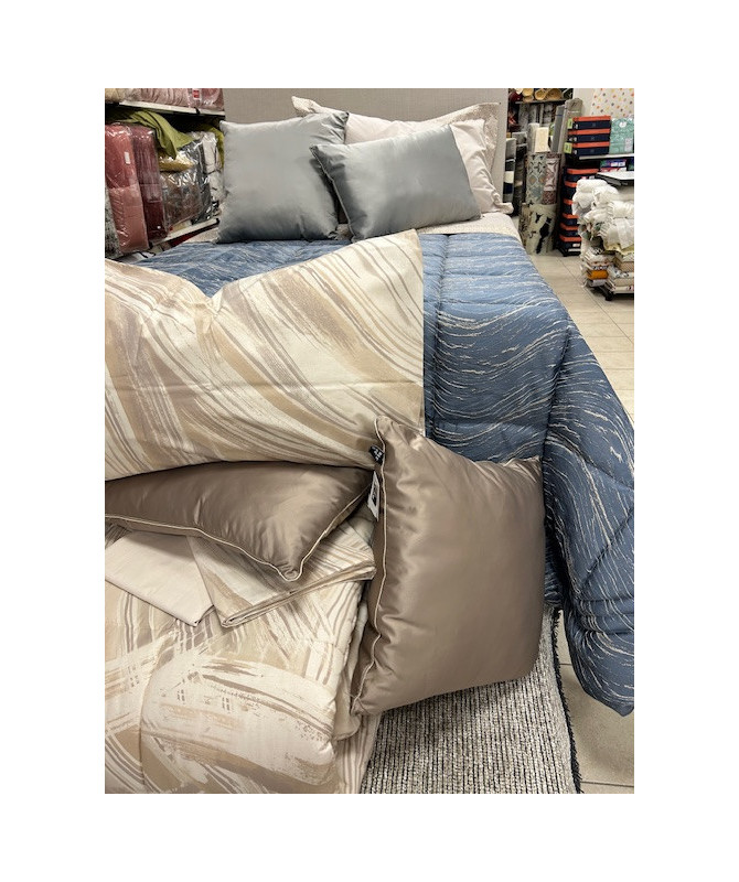 Trapuntatura piazzata a quadri con tre cornici e chiusura con angoli a trapezio. imbottitura in poliestere riciclato 330grmq matrimonliale 260x270