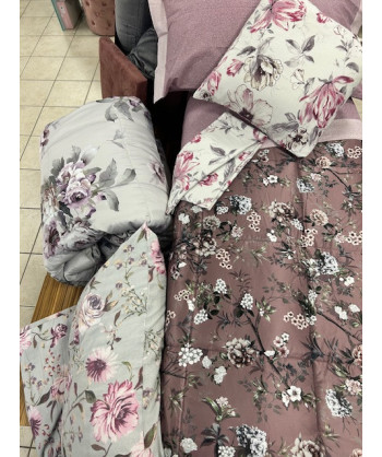 Con elegante stampa floreale su tessuto di puro cotone. Imbottitura con fibra di polestere rigenerato 320gr/mq Misura matrimoniale 260x260 Prodotta interamente in Italia
