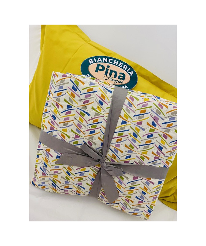 In puro cotone su entrambi sul lato superiore stampa geometrica e sul lato inferiore rigato con le stesse nuance di colore. Disponibile nelle misure matrimoniale 260x270 piazza e mezzo 220x270 singolo 180x270