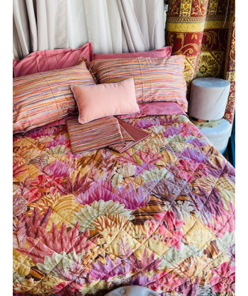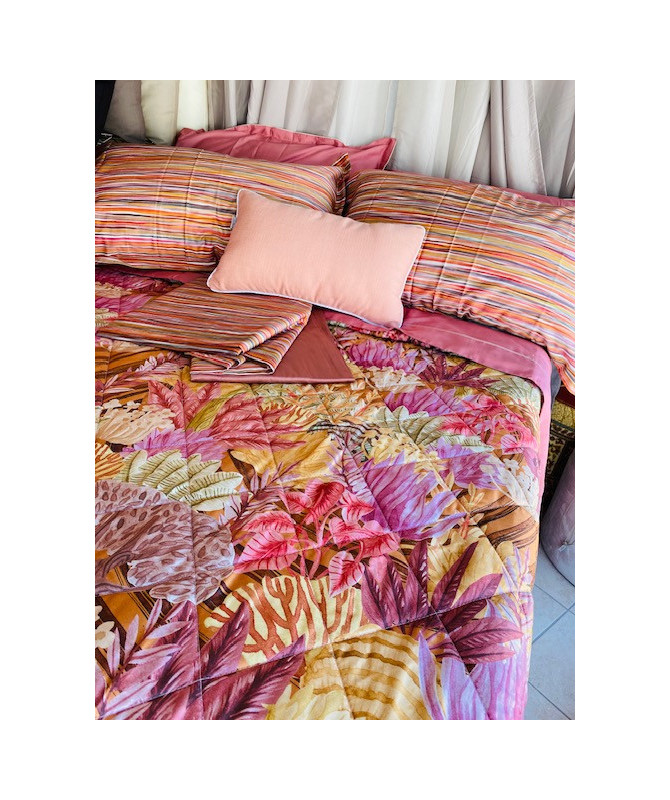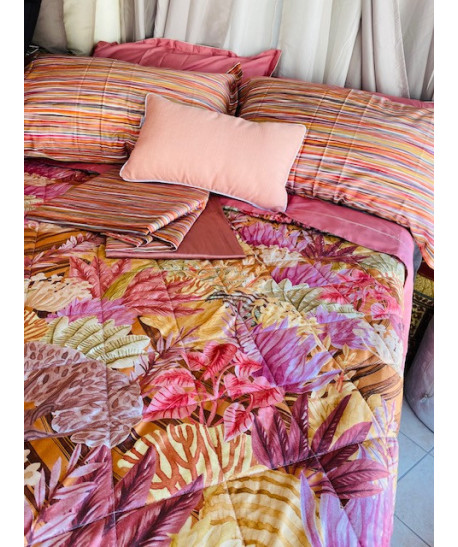 Copriletto trapuntato Reveer Madagascar Tessuto esterno superiore raso di cotone 300fili mq con stampa digitale tessuto inferiore puro cotone in tinta unita imbottitura in fibra anallergica di poliestere 100grmq misura 260x270 made in Italy
