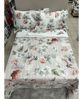 In puro cotone su entrambi sul lato superiore motivo floreale e sul lato inferiore piccoli fiorellini. Disponibile nelle misure matrimoniale 260x270